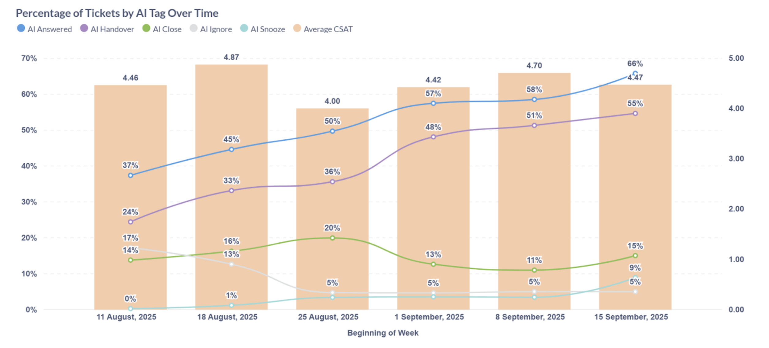 Initial Drop: The sharp decline in CSAT from August 18 to September 1 coincides with a significant increase in the AI Answered percentage, which rises from 30% to 33% (+10%). This suggests that as the AI’s scope was expanded to engage with a broader range of customer queries, there was an initial period where its responses were not yet fully optimized, leading to a temporary decrease in customer satisfaction.