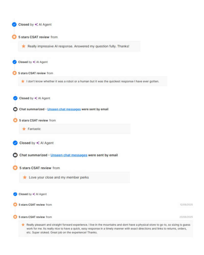 This outerwear brand increased AI agent share of resolutions from 37% to 66% for all inbound messages, while maintaining an overall CSAT score of 4.65/5.