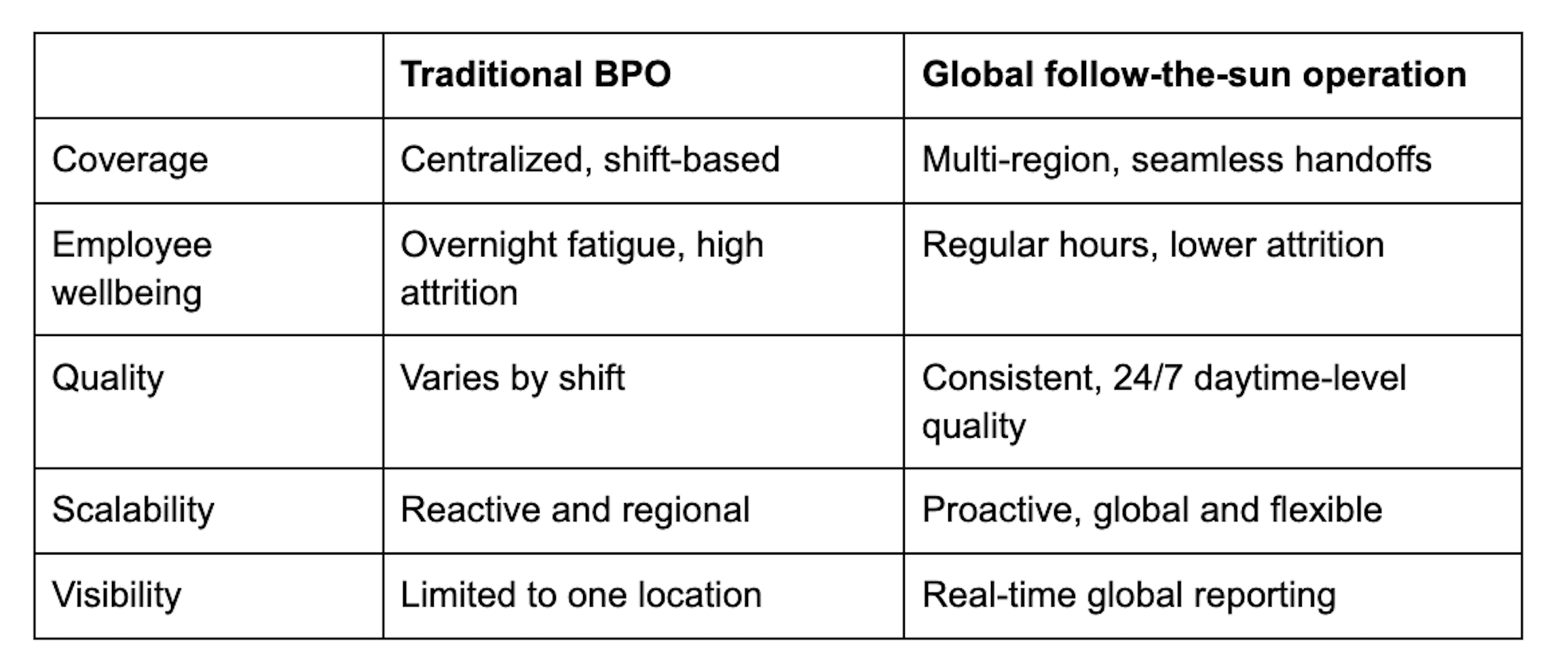 That shift has forced businesses to look beyond legacy outsourcing models and toward global, always-on operations that keep quality high at every hour of the day.